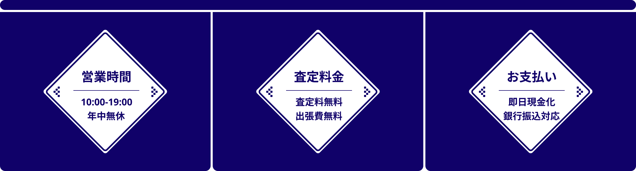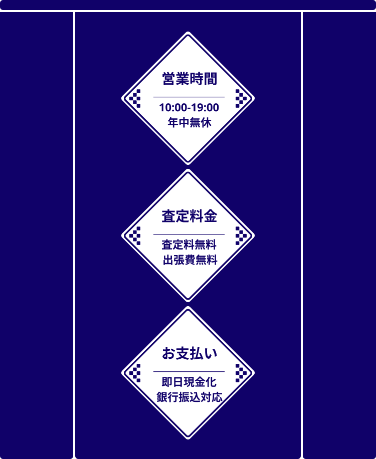 店頭買取・出張買取ともに、査定金額にご納得いただけましたら、その場で現金でお支払いいたします。銀行振込をご希望の場合は、翌営業日までにお振込みいたします。