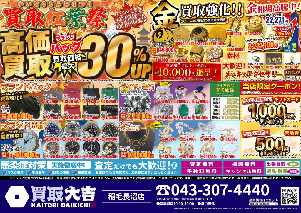金・プラチナ・貴金属、ブランド時計、ブランドバッグ、ダイヤモンド・宝石、スマートフォン・タブレット、カメラ・レンズ、記念コイン、切手など幅広く買取しております。詳細は買取品目をご確認ください。